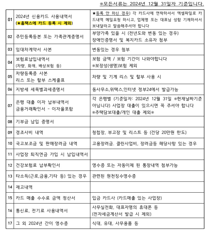 추가로, 사업자가 경비 처리를 위한 서류(예: 임대차 계약서, 통신비, 차량 유지비 등)를 준비하면 절세에 큰 도움이 됩니다.