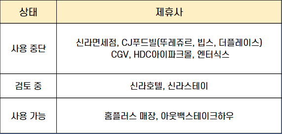 이러한 이유로 CJ푸드빌(빕스, 뚜레쥬르, 더플레이스), 신라면세점, CGV 등 일부 업체들은 홈플러스 상품권 사용을 중단했습니다. HDC아이파크몰, 에버랜드, 아웃백스테이크하우스 등도 사용 제한을 검토 중입니다.