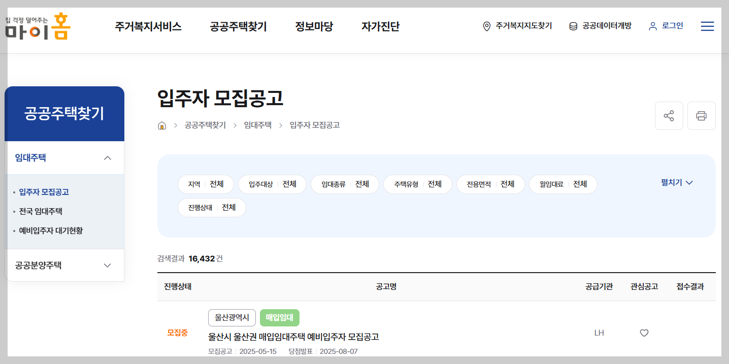 임대주택 공고를 가장 손쉽게 찾을 수 있는 곳은 바로 마이홈포털입니다.