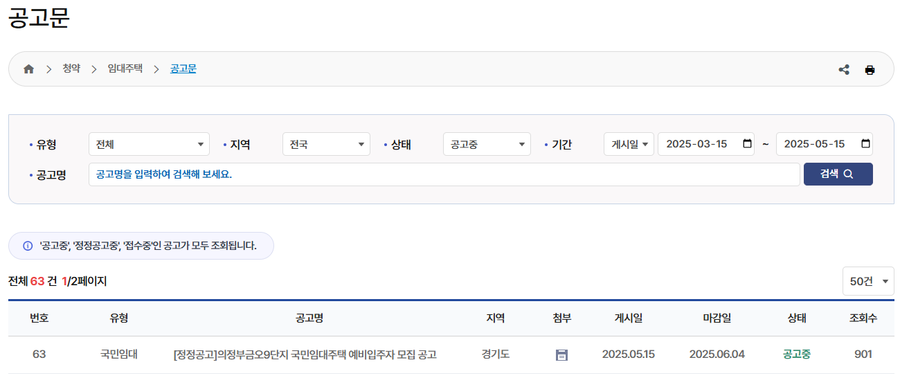 Tip. 마이홈포털 외에도, LH 청약센터, SH공사, iH공사 등 각 기관 홈페이지를 자주 방문하면 실시간 공고를 빠르게 확인할 수 있습니다.