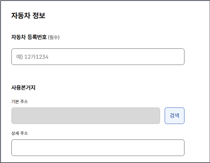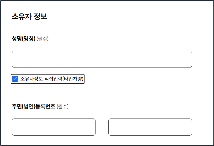· 타인 차량 조회 시: 소유자 성명과 주민번호 입력 → “소유자 정보 직접 입력” 체크 필수