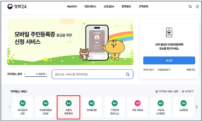 · 접속 후, ‘자주 찾는 서비스’ → ‘자동차등록원부’ 검색 또는 클릭