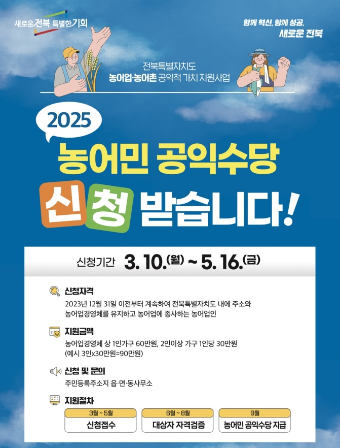 👉 농업인의 소득 보장과 안정적인 영농활동을 위한 공익수당! 꼭 신청하셔서 혜택을 받으시길 바랍니다.