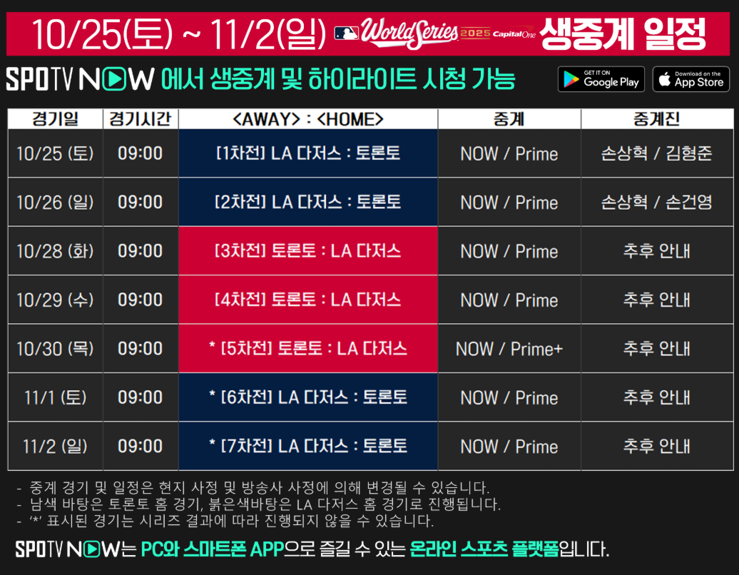 LA 다저스와 토론토 블루제이스의 2025 MLB 월드시리즈가 25일(토)부터 시작됩니다.