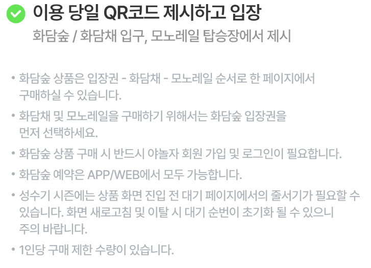· 입장권 없이는 화담채, 모노레일 이용 불가합니다.