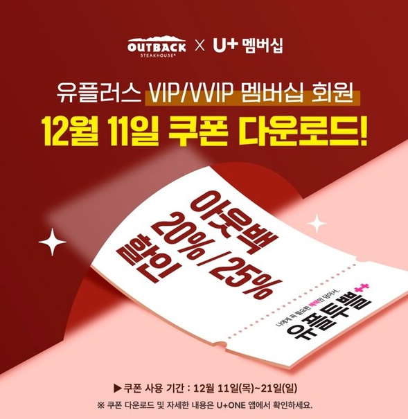 연말 모임이 폭발적으로 늘어나는 12월, 그 어느 때보다 외식비 부담이 커지는 시기입니다. 이런 때 딱 맞춰 아웃백 스테이크하우스가 LG유플러스와 함께 강력한 혜택을 담은 12월 ‘유플투쁠’ 프로모션을 선보였습니다. 단 하루 발급, 10일간 사용 가능이라는 제한된 구조 덕분에 참여자들 사이에서는 “놓치면 후회한다”는 반응이 나오는 행사죠.